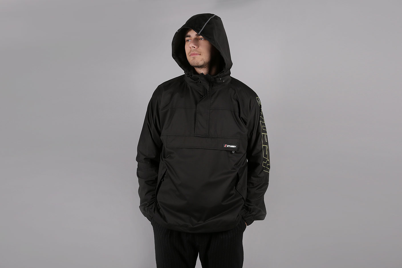 Чёрный мужской анорак с капюшоном от Stussy. Двухслойная модель из 100% полиэстра с сетчатой подкладкой.